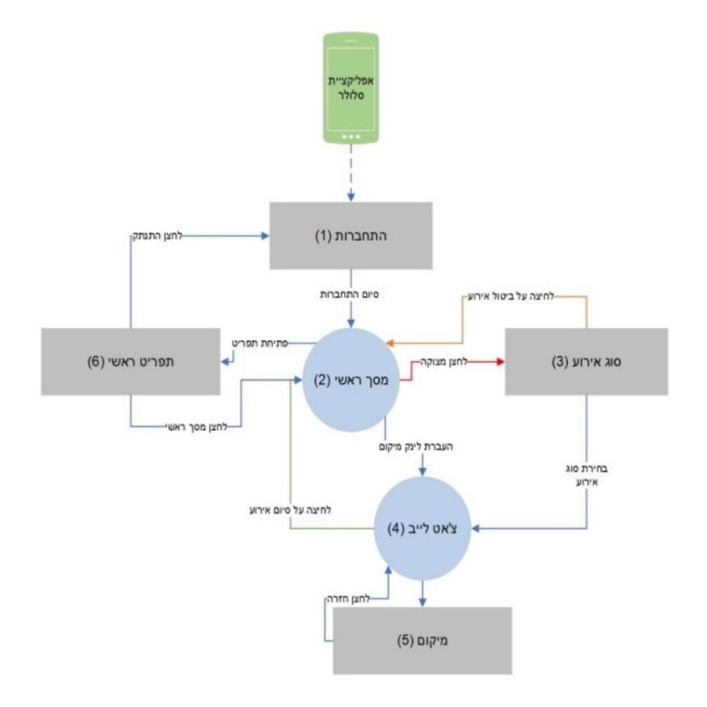 ביטחוניים / בטיחותיים. בלחיצה על כל אחד מהלחצנים המשתמש יועבר למסך הצ’אט, ולכלל המשתמשים תישלח הודעת טקסט על התרעת האירוע הרלוונטי, ובנוסף יהיה ניתן לבטל אירוע.